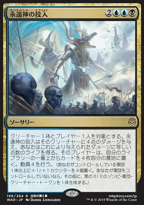 Enter the God-Eternals deals 4 damage to target creature and you gain life equal to the damage dealt this way. Target player mills four cards. Amass Zombies 4. (Put four +1/+1 counters on an Army you control. It's also a Zombie. If you don't control an Army, create a 0/0 black Zombie Army creature token first.)