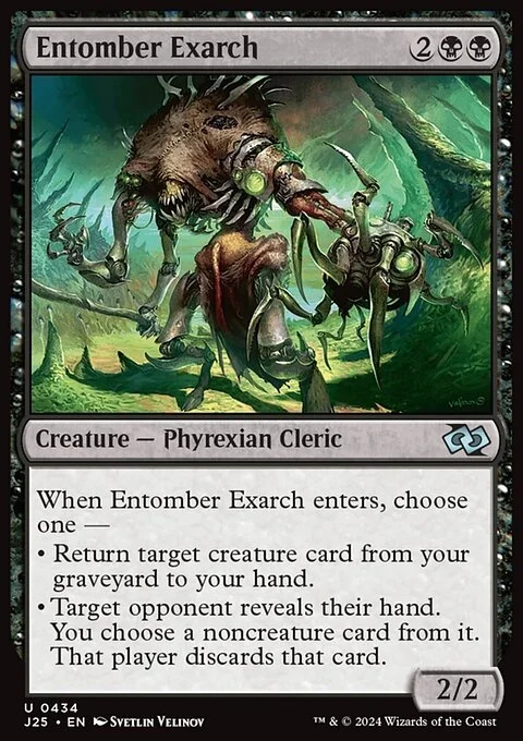 When Entomber Exarch enters, choose one — • Return target creature card from your graveyard to your hand. • Target opponent reveals their hand. You choose a noncreature card from it. That player discards that card.