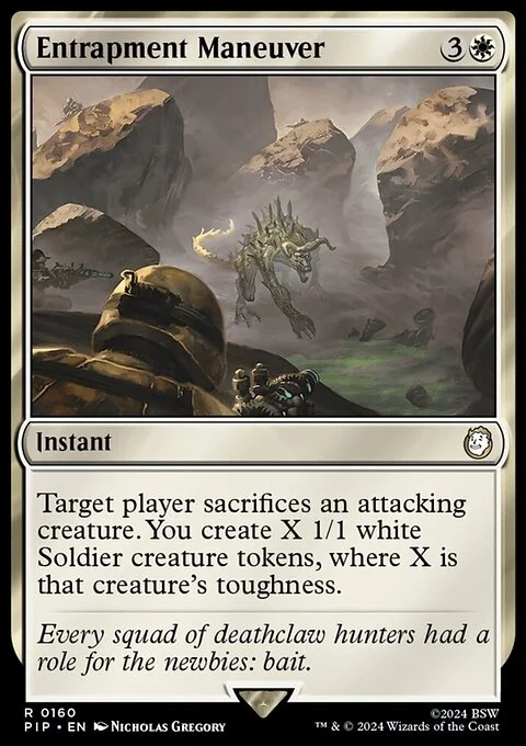 Target player sacrifices an attacking creature of their choice. You create X 1/1 white Soldier creature tokens, where X is that creature's toughness.