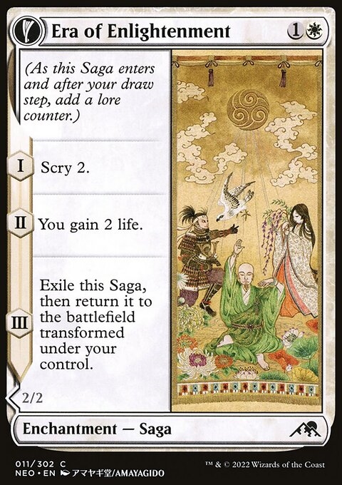 Era of Enlightenment (As this Saga enters and after your draw step, add a lore counter.) I — Scry 2. II — You gain 2 life. III — Exile this Saga, then return it to the battlefield transformed under your control. Hand of Enlightenment First strike