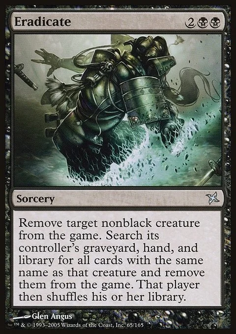 Exile target nonblack creature. Search its controller's graveyard, hand, and library for all cards with the same name as that creature and exile them. Then that player shuffles.