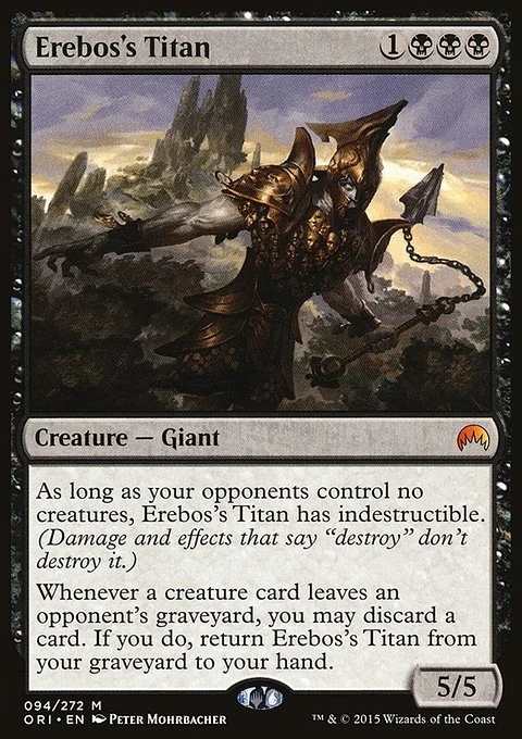 Whenever a creature card leaves an opponent's graveyard, you may discard a card. If you do, return Erebos's Titan from your graveyard to your hand.