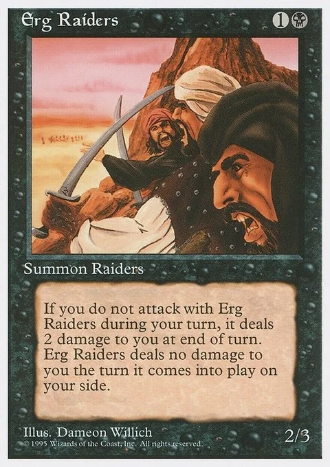 At the beginning of your end step, if Erg Raiders didn't attack this turn, Erg Raiders deals 2 damage to you unless it came under your control this turn.