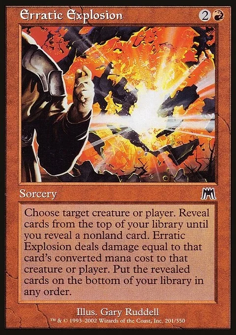 Choose any target. Reveal cards from the top of your library until you reveal a nonland card. Erratic Explosion deals damage equal to that card's mana value to that permanent or player. Put the revealed cards on the bottom of your library in any order.