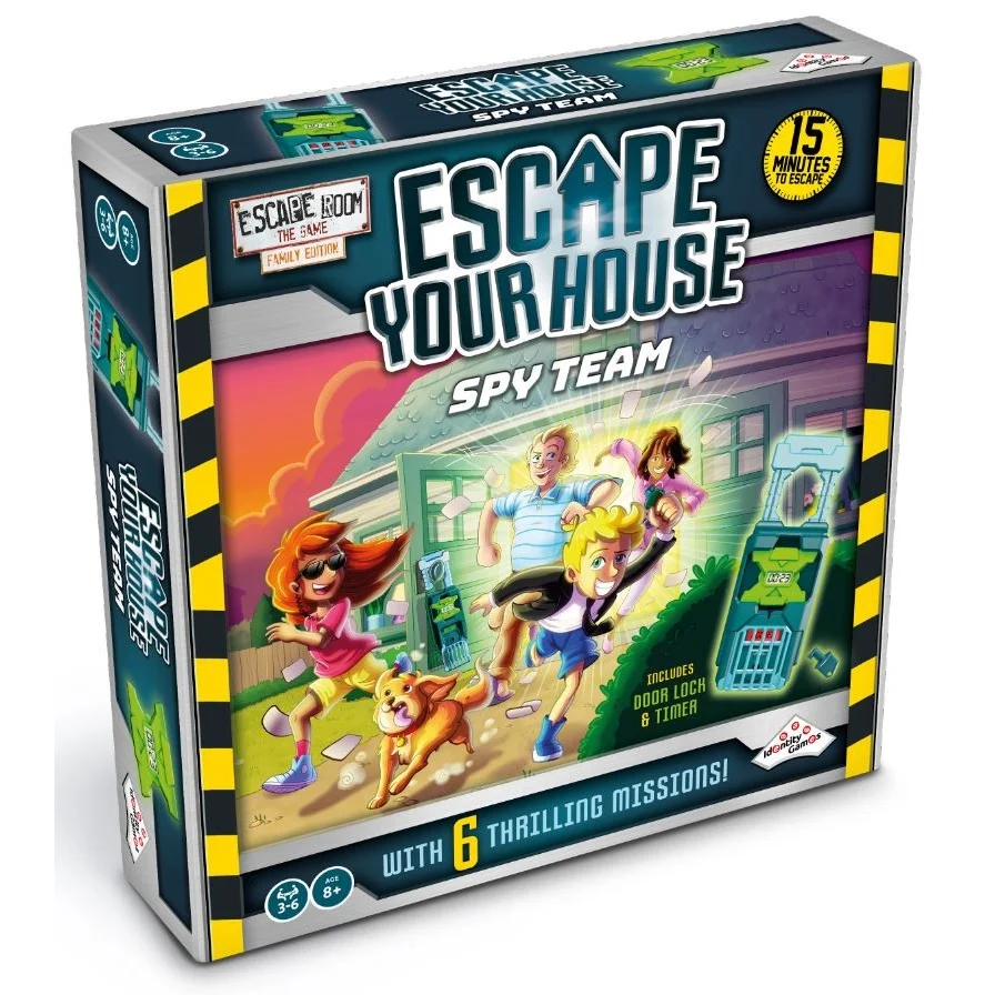 Escape Your House isn't played around the dinner table, but throughout various rooms of your house. Puzzles will be placed in rooms, locks will be hung on doors and the front door will be closed off by a special Spy Lock. When the mission starts you and your team have 15 minutes to find all keys by solving puzzles, unlock all doors, and finally find the key of the Spy Lock. Use that key to open the Spy Lock, stop the timer and escape your own house!