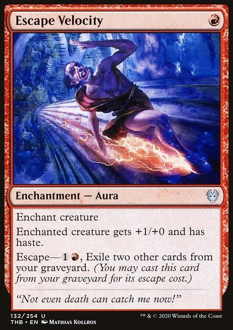 Enchant creature Enchanted creature gets +1/+0 and has haste. Escape—{1}{R}, Exile two other cards from your graveyard. (You may cast this card from your graveyard for its escape cost.)