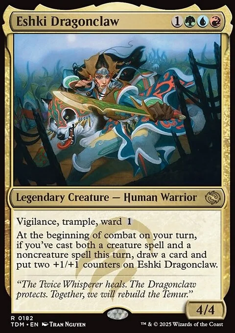 Vigilance, trample, ward {1} At the beginning of combat on your turn, if you've cast both a creature spell and a noncreature spell this turn, draw a card and put two +1/+1 counters on Eshki Dragonclaw.