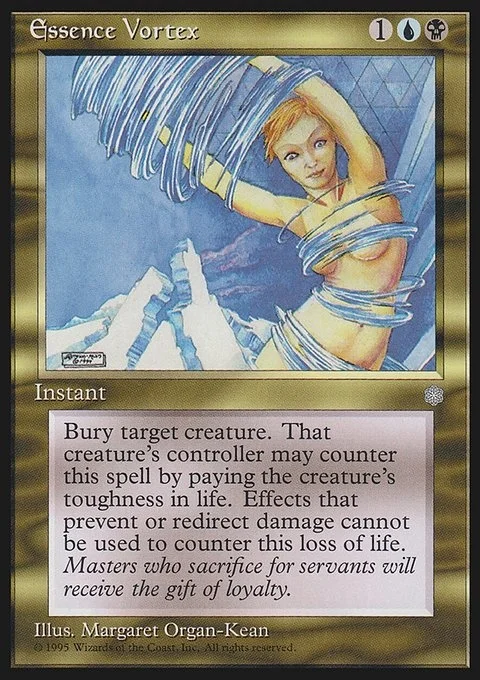 Bury target creature. That creature’s controller may counter this spell by paying the creature’s toughness in life. Effects that prevent or redirect damage cannot be used to counter this loss of life.