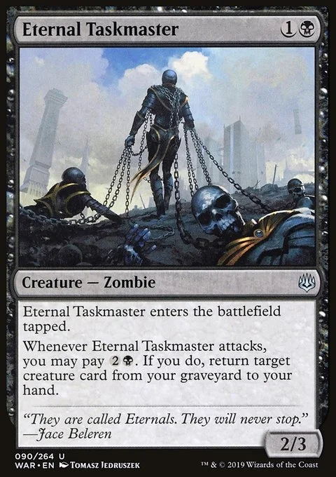 Eternal Taskmaster enters the battlefield tapped. Whenever Eternal Taskmaster attacks, you may pay {2}{B}. If you do, return target creature card from your graveyard to your hand.