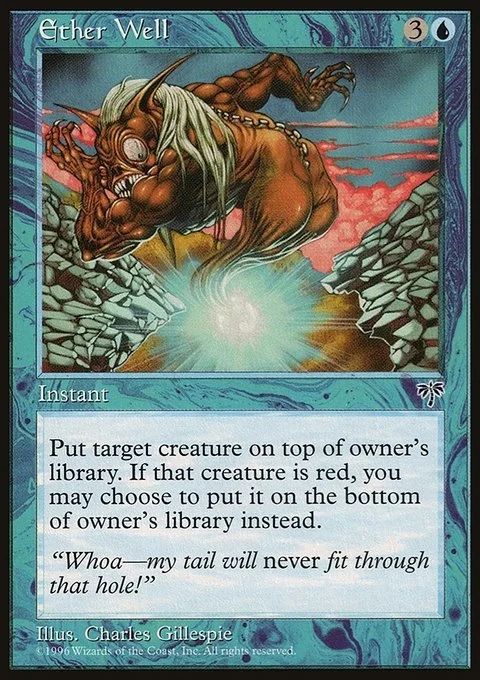 Put target creature on top of owner’s library. If that creature is red, you may choose to put it on the bottom of owner’s library instead.
