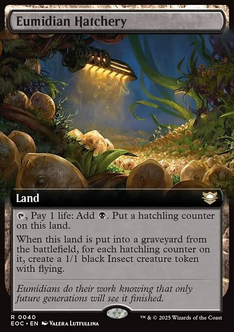 {T}, Pay 1 life: Add {B}. Put a hatchling counter on this land. When this land is put into a graveyard from the battlefield, for each hatchling counter on it, create a 1/1 black Insect creature token with flying.