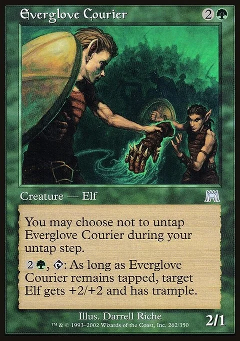 You may choose not to untap Everglove Courier during your untap step. {2}{G}, {T}: Target Elf creature gets +2/+2 and has trample for as long as Everglove Courier remains tapped.