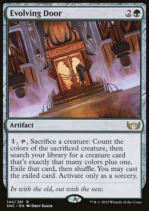 {1}, {T}, Sacrifice a creature: Count the colors of the sacrificed creature, then search your library for a creature card that's exactly that many colors plus one. Exile that card, then shuffle. You may cast the exiled card. Activate only as a sorcery.