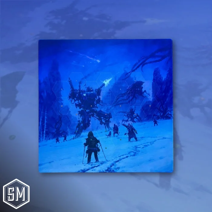 This natural rubber playmat for Expeditions has double-stitched edges for durability. It is double-sided (one side with outlines for hexes, cards, and basecamp and one side just with art), and it fits the core components needed for a 5-player game (location tiles, basecamp, and mech mats), with flexible positioning for various player counts and table configurations. It measures 900x900mm.