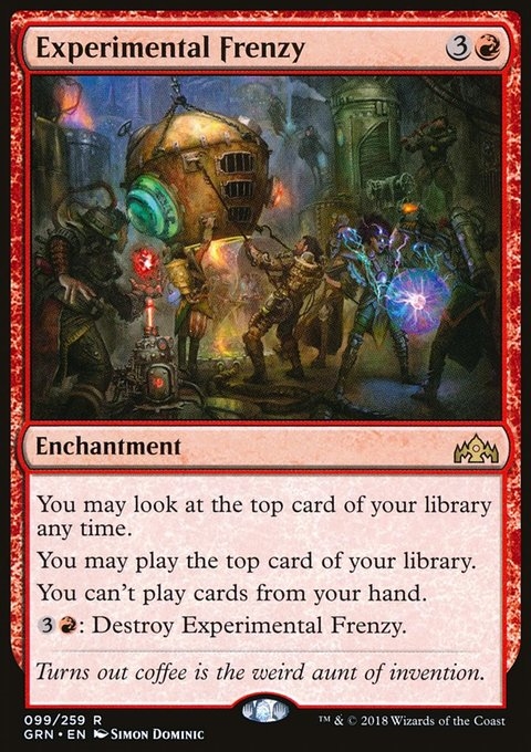 You may look at the top card of your library any time. You may play lands and cast spells from the top of your library. You can't play lands or cast spells from your hand. {3}{R}: Destroy this enchantment.