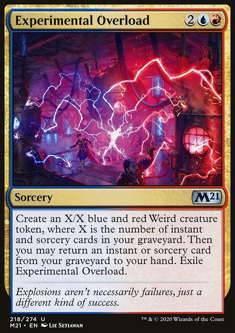 Create an X/X blue and red Weird creature token, where X is the number of instant and sorcery cards in your graveyard. Then you may return an instant or sorcery card from your graveyard to your hand. Exile Experimental Overload.