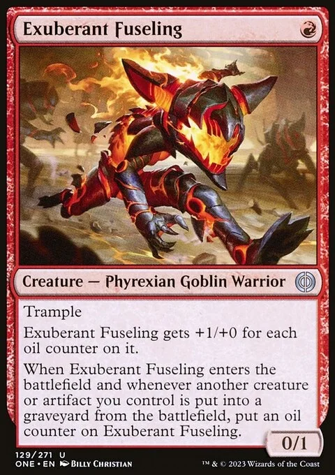 Trample This creature gets +1/+0 for each oil counter on it. When this creature enters and whenever another creature or artifact you control is put into a graveyard from the battlefield, put an oil counter on this creature.