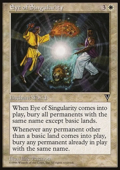 When Eye of Singularity comes into play, bury all permanents with the same name except basic lands.Whenever any permanent other than a basic land comes into play, bury any permanent already in play with the same name.
