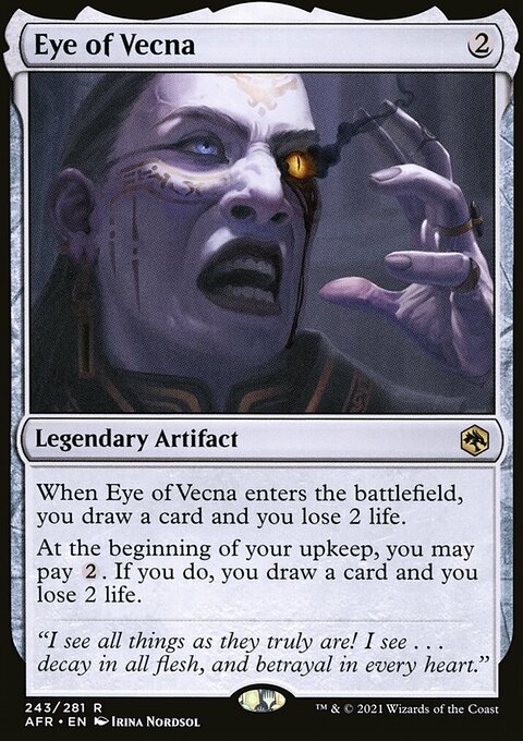 When Eye of Vecna enters the battlefield, you draw a card and you lose 2 life. At the beginning of your upkeep, you may pay {2}. If you do, you draw a card and you lose 2 life.