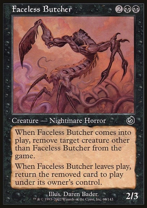 When Faceless Butcher enters, exile another target creature. When Faceless Butcher leaves the battlefield, return the exiled card to the battlefield under its owner's control.