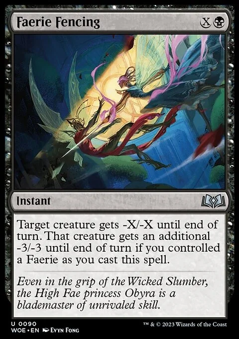 Target creature gets -X/-X until end of turn. That creature gets an additional -3/-3 until end of turn if you controlled a Faerie as you cast this spell.