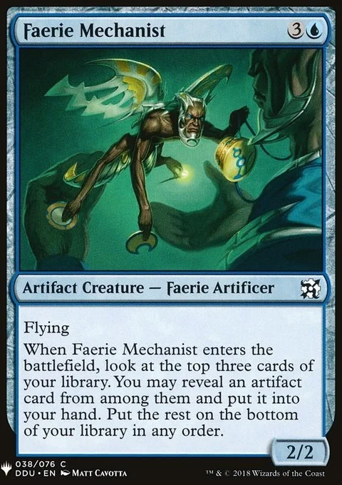 Flying When this creature enters, look at the top three cards of your library. You may reveal an artifact card from among them and put it into your hand. Put the rest on the bottom of your library in any order.