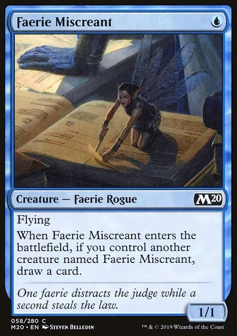 Flying When this creature enters, if you control another creature named Faerie Miscreant, draw a card.