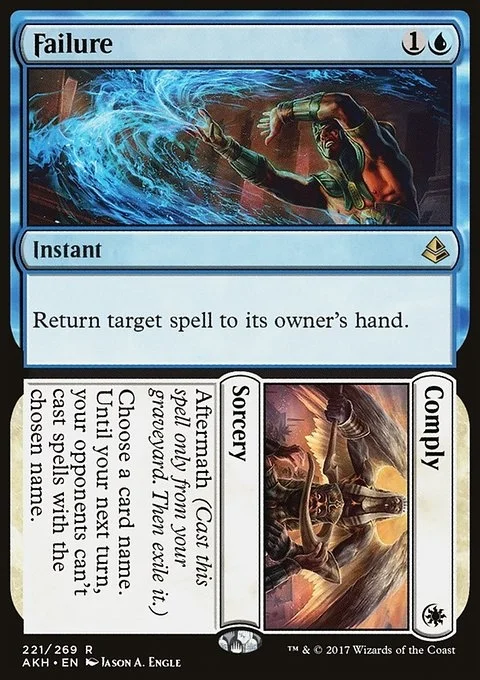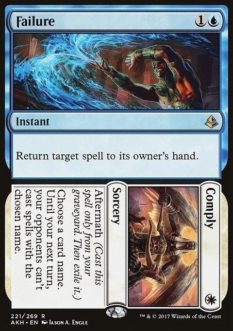 Failure Return target spell to its owner's hand. Comply Aftermath (Cast this spell only from your graveyard. Then exile it.) Choose a card name. Until your next turn, your opponents can't cast spells with the chosen name.