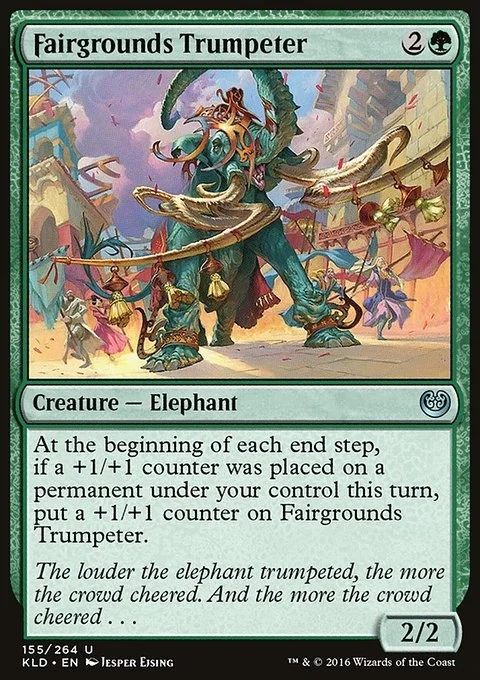At the beginning of each end step, if a +1/+1 counter was put on a permanent under your control this turn, put a +1/+1 counter on Fairgrounds Trumpeter.