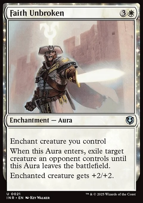 Enchant creature you control When Faith Unbroken enters, exile target creature an opponent controls until Faith Unbroken leaves the battlefield. Enchanted creature gets +2/+2.