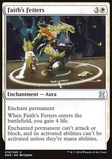 Enchant permanent When Faith's Fetters enters the battlefield, you gain 4 life. Enchanted permanent can't attack or block, and its activated abilities can't be activated unless they're mana abilities.