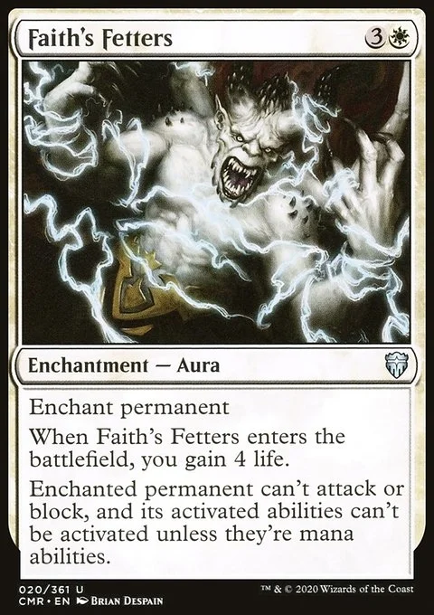 Enchant permanent When Faith's Fetters enters the battlefield, you gain 4 life. Enchanted permanent can't attack or block, and its activated abilities can't be activated unless they're mana abilities.