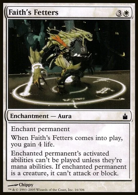 Enchant permanent When Faith's Fetters enters, you gain 4 life. Enchanted permanent can't attack or block, and its activated abilities can't be activated unless they're mana abilities.