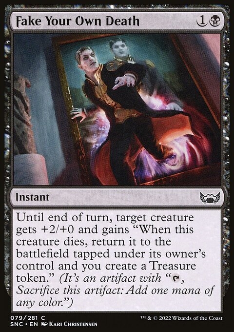 Until end of turn, target creature gets +2/+0 and gains "When this creature dies, return it to the battlefield tapped under its owner's control and you create a Treasure token." (It's an artifact with "{T}, Sacrifice this token: Add one mana of any color.")