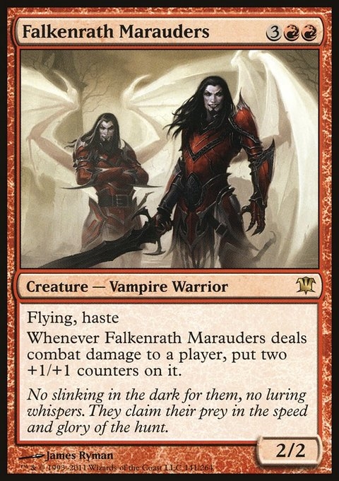 Flying, haste Whenever Falkenrath Marauders deals combat damage to a player, put two +1/+1 counters on it.