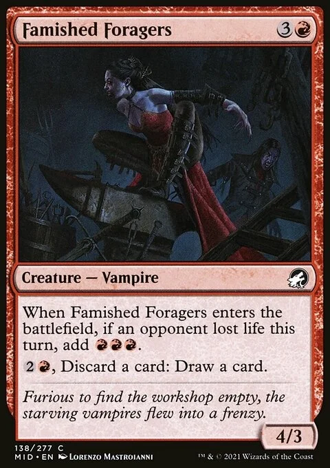 When this creature enters, if an opponent lost life this turn, add {R}{R}{R}. {2}{R}, Discard a card: Draw a card.