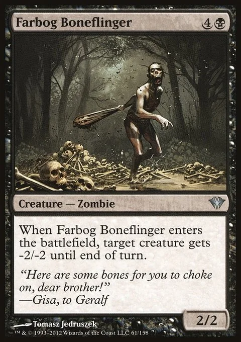 When Farbog Boneflinger enters the battlefield, target creature gets -2/-2 until end of turn.