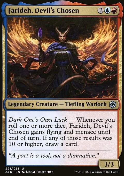 Dark One's Own Luck — Whenever you roll one or more dice, Farideh, Devil's Chosen gains flying and menace until end of turn. If any of those results was 10 or higher, draw a card.