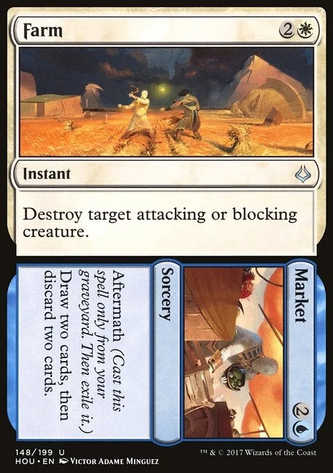 Farm Destroy target attacking or blocking creature. Market Aftermath (Cast this spell only from your graveyard. Then exile it.) Draw two cards, then discard two cards.