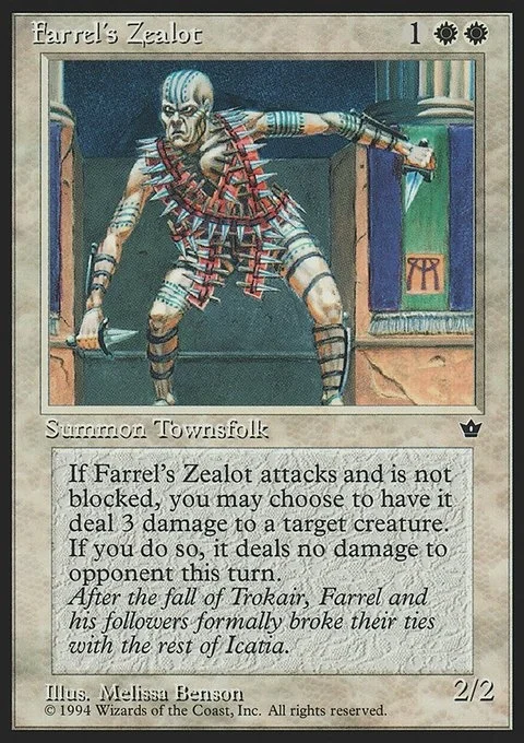 Whenever Farrel's Zealot attacks and isn't blocked, you may have it deal 3 damage to target creature. If you do, Farrel's Zealot assigns no combat damage this turn.
