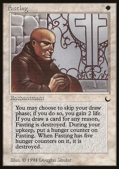 You may choose to skip your draw phase; if you do so, you gain 2 life. If you draw a card for any reason, Fasting is destroyed. During your upkeep, put a hunger counter on Fasting. When Fasting has five hunger counters on it, it is destroyed.