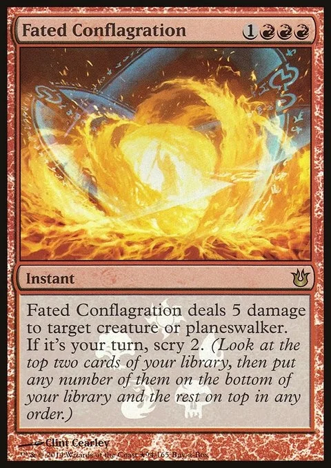 Fated Conflagration deals 5 damage to target creature or planeswalker. If it's your turn, scry 2. (Look at the top two cards of your library, then put any number of them on the bottom of your library and the rest on top in any order.)