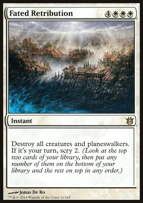 Destroy all creatures and planeswalkers. If it's your turn, scry 2. (Look at the top two cards of your library, then put any number of them on the bottom of your library and the rest on top in any order.)