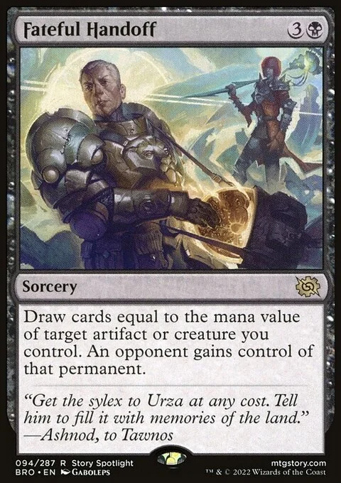 Draw cards equal to the mana value of target artifact or creature you control. An opponent gains control of that permanent.