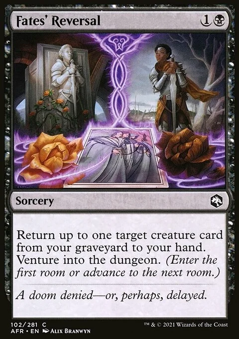 Return up to one target creature card from your graveyard to your hand. Venture into the dungeon. (Enter the first room or advance to the next room.)