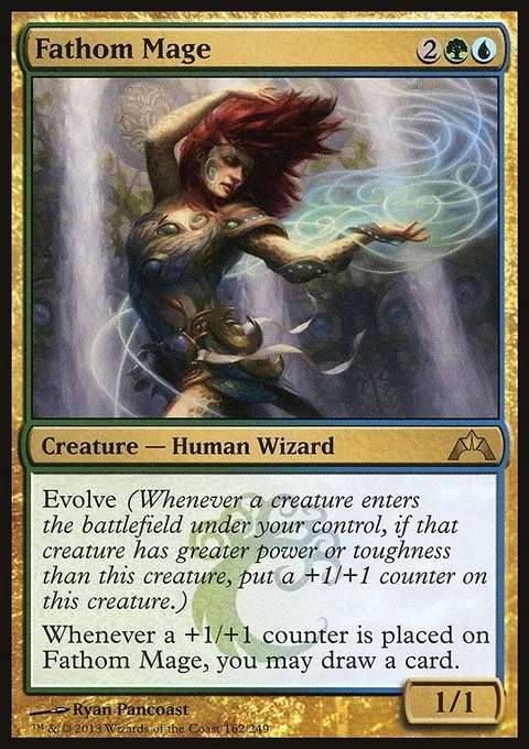 Evolve (Whenever a creature enters the battlefield under your control, if that creature has greater power or toughness than this creature, put a +1/+1 counter on this creature.) Whenever a +1/+1 counter is put on Fathom Mage, you may draw a card.