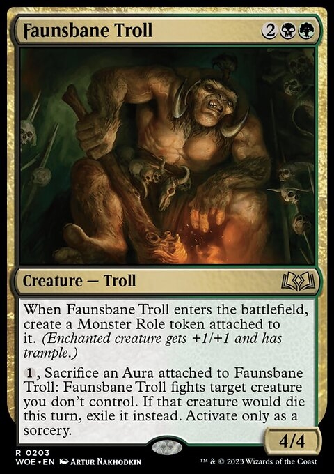 When Faunsbane Troll enters, create a Monster Role token attached to it. (Enchanted creature gets +1/+1 and has trample.)