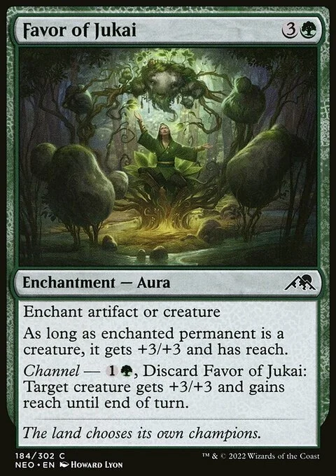 Enchant artifact or creature As long as enchanted permanent is a creature, it gets +3/+3 and has reach. Channel — {1}{G}, Discard this card: Target creature gets +3/+3 and gains reach until end of turn.