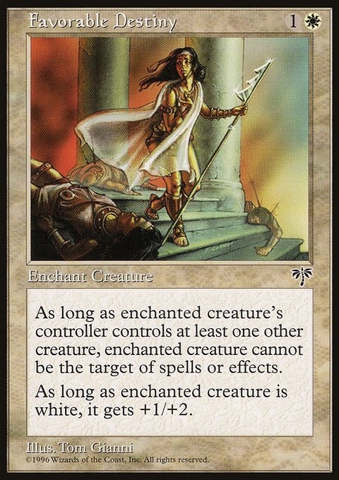 As long as enchanted creature’s controller controls at least one other creature, enchanted creature cannot be the target of spells or effects.As long as enchanted creature is white, it gets +1/+2.