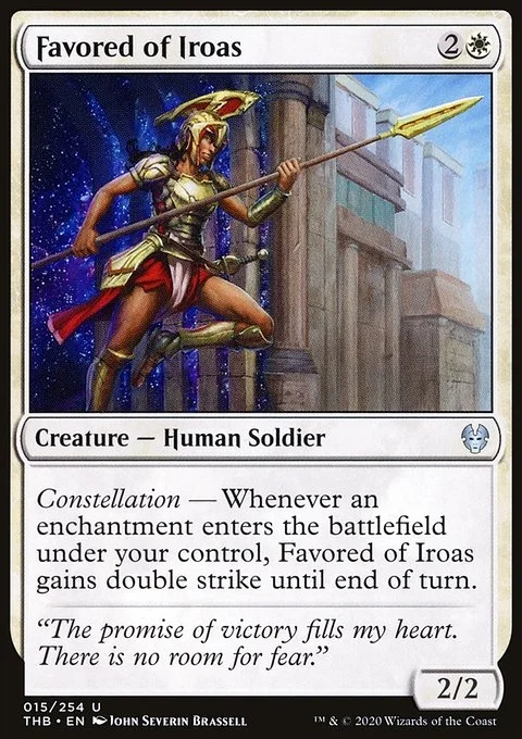 Constellation — Whenever an enchantment enters the battlefield under your control, Favored of Iroas gains double strike until end of turn.